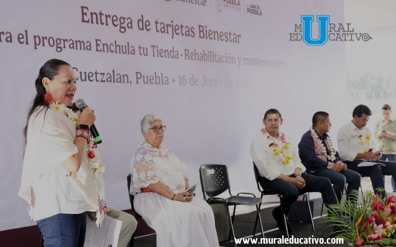 Cuetzalan, Pue.- Durante la entrega de tarjetas Bienestar del Programa “Enchula tu tienda-rehabilitación y mantenimiento”, la directora general de Seguridad Alimentaria Mexicana del Gobierno de México, María Luisa Albores, propuso al gobernador Alejandro Armenta que los productos Cinco de Mayo sean distribuidos en las más de mil 300 Tiendas del Bienestar en beneficio de las y los productores poblanos.