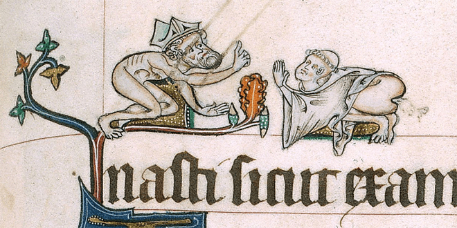El Salterio de Rutland (c. 1260) es famoso por sus anotaciones vívidas y fantásticas, que incluyen una «bestia de tres cabezas» siendo apuñalada por un caracol con cuerno de unicornio, junto a una gran variedad de monstruos, animales humanizados y escenas de vida cotidiana que ilustran fábulas y tradiciones del bestiario, poblando casi todos los márgenes y mostrando un mundo invertido y a menudo sádico, como conejos atacando a caballeros.